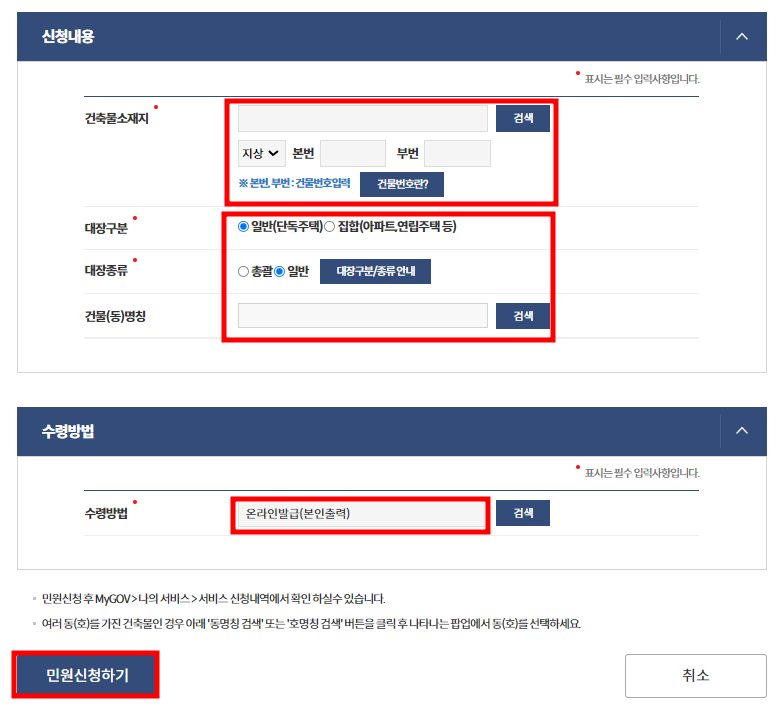 민원신청하기 버튼을 눌러 신청해주시면 완료입니다.